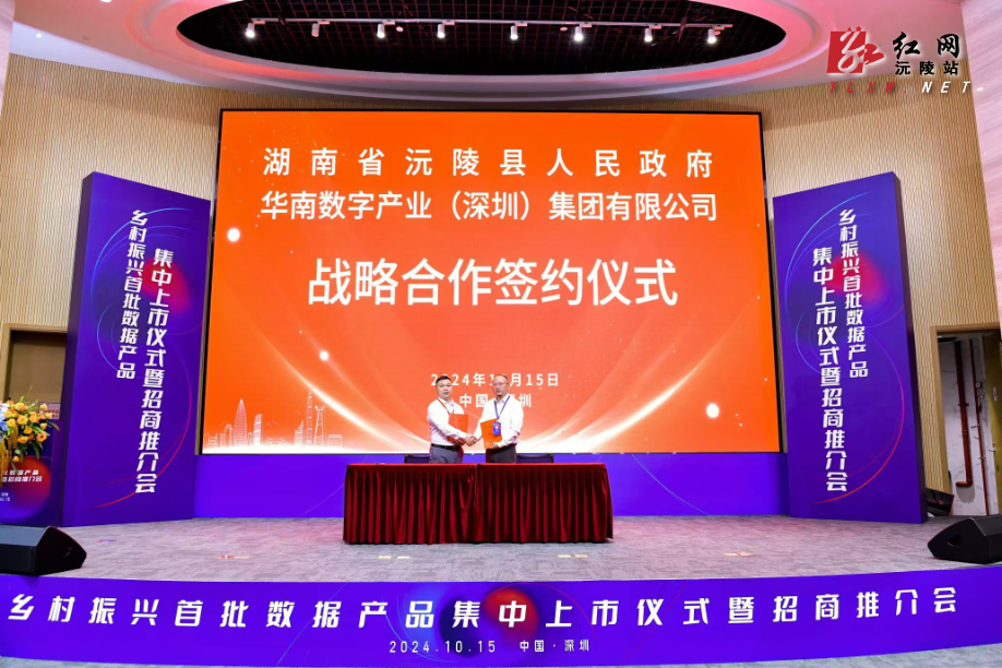 仪式上,活动主办方为乡村振兴首批数据上市县颁发上市证书及牌匾;县委常委、副县长王强代表沅陵县人民政府与华南数字产业(深圳)集团有限公司进行战略合作签约并作招商推介。